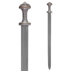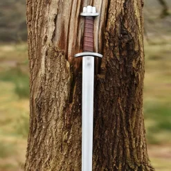 Dit prachtige decoratieve zwaard is een aanwinst voor liefhebbers van vroegmiddeleeuwse zwaarden! Het zwaard is een exacte replica van een origineel uit de 8ste eeuw die is opgegraven bij Fetter Lane in Londen. In 1893 is hij gedoneerd aan het British Museum, waar je hem vandaag de dag nog steeds kunt bewonderen. De originele grip is vervaardigd van verguld zilver en is zeer intact gebleven. Vanwege het dure edelmetaal en het vakmanschap dat te pas is gekomen bij het vervaardigen van dit zwaard, vermoeden archeologen dat dit eigendom was van een elitestrijder of edelman. De kling van het origineel is niet bewaard gebleven, dus bij de vervaardiging van deze replica is gekozen voor een veelvoorkomend type vroegmiddeleeuwse kling met een brede bloedgoot. De grip van de replica is gemaakt van vertind brons, hierdoor wordt het uiterlijk van het zilveren origineel benaderd maar blijft de prijs lager. Net zoals het origineel is de grip gemaakt van verschillende onderdelen die aan elkaar zijn geklonken. De grip en pommel zijn gedecoreerd met prachtige vroegmiddeleeuwse organische motieven. Het zwaard wordt geleverd inclusief een bruine leren schede en schedebeslag van vertind brons en een riemlus zodat je hem aan je riem kunt hangen.