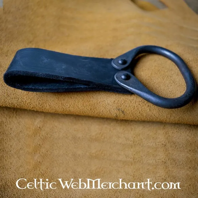Dit is een authentieke, praktische bijlhouder. De lus kan aan de riem bevestigd worden en in de ring kan een bijl worden gehangen. De binnenmaat van de ring is 7 x 4,5 cm. De houder is van echt leer met een handgesmede, vastgeklonken ring.