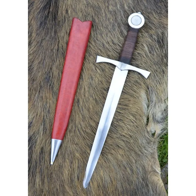 Dergelijke korte dolken waren in de middeleeuwen erg populair. Niet alleen bij ridders als wapen naast hun zwaard, maar ook door gewone soldaten, piekeniers en boogschutters. Dit model werd tussen de 14de en 15de eeuw gebruikt. De dolk heeft een kling van verenstaal en is semi-scherp. Hij wordt geleverd inclusief houten, met leer overtrokken schede. Het rode leer van de schede geeft de dolk een luxe uitstraling.