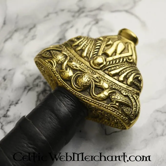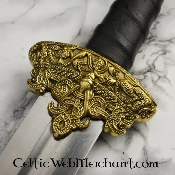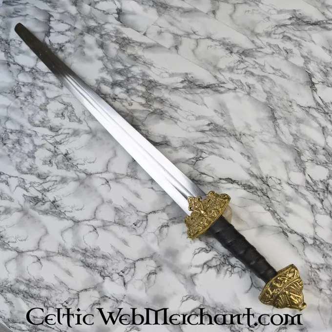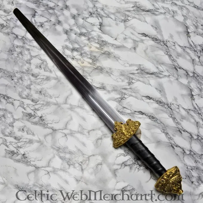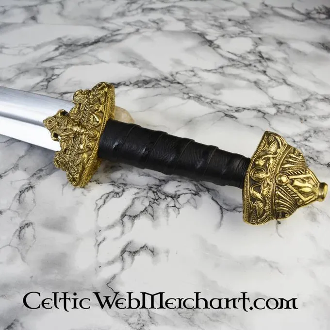 De messingen pommel en de pareerstang zijn rijkelijk versierd. Dit trainingszwaard is geschikt voor lichte zwaardgevechten. Het zwaard is 90 cm lang en heeft een brede kling van 60 cm. Dit zwaard is een Petersen type Z.