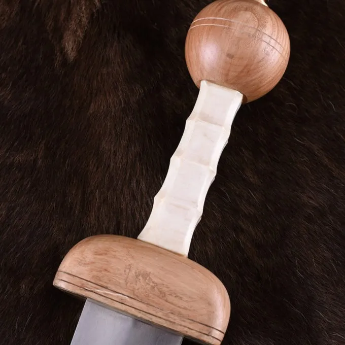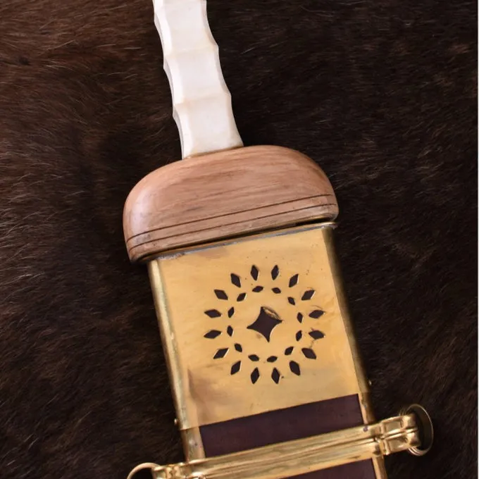 Materiaal: EN45 verenstaal, hout, been, messing, leer / / Snede: semi-scherp (alleen voor decoratief gebruik) / / Lengte: 72 cm / / Lengte kling: 52 cm / / Lengte grip: 9,5 cm / / Max. breedte kling: 5,3 cm / / Balanspunt: ca. 10 cm onder gevest / / Inclu