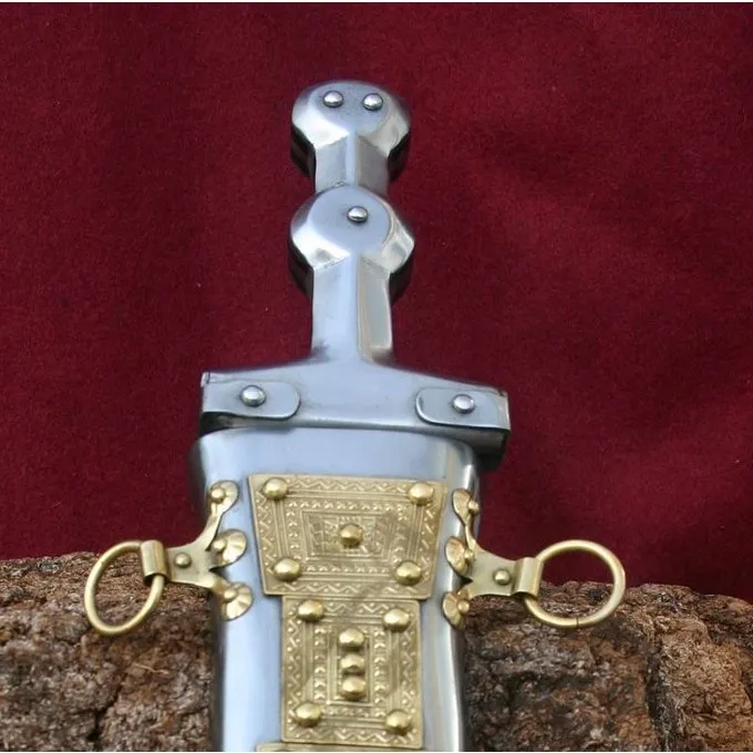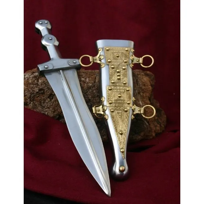Gemaakt naar een exemplaar zoals die in de 1ste eeuw n.Chr. werd gemaakt. Hij heeft een decoratieve stalen schede, ingelegd met messing. De dolk is 34 cm lang, met een blad van 21,5 cm en een snede van 1 mm. Gewicht: 700 gram.
