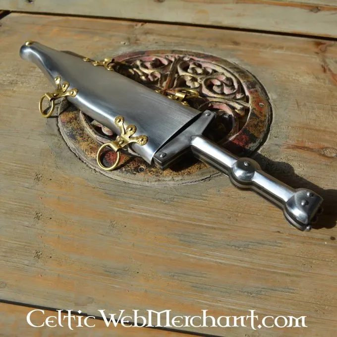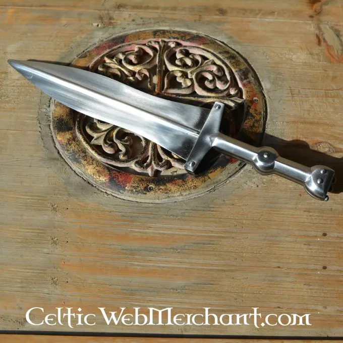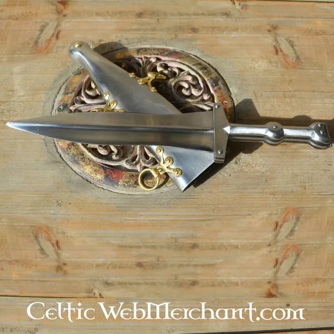 Productdetails: Lengte: 34.5 cm / Klinglengte: 22 cm / Griplengte: 12.5 cm / Gewicht: 700 g / Staaltype kling: En45 koolstofstaal hardheid 48 HRC. / Snede: Semi-scherp / Tangconstructie: Volledige tangconstructie / Gebaseerd op historisch origineel: Ja /