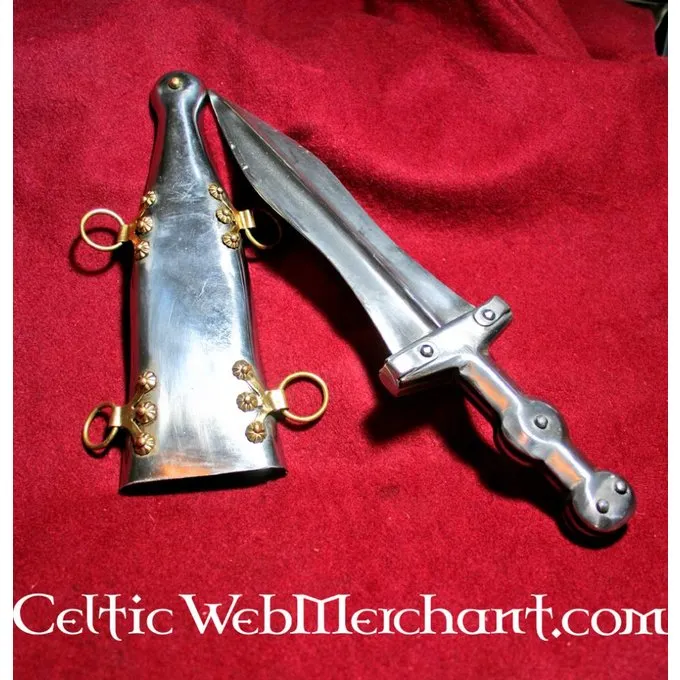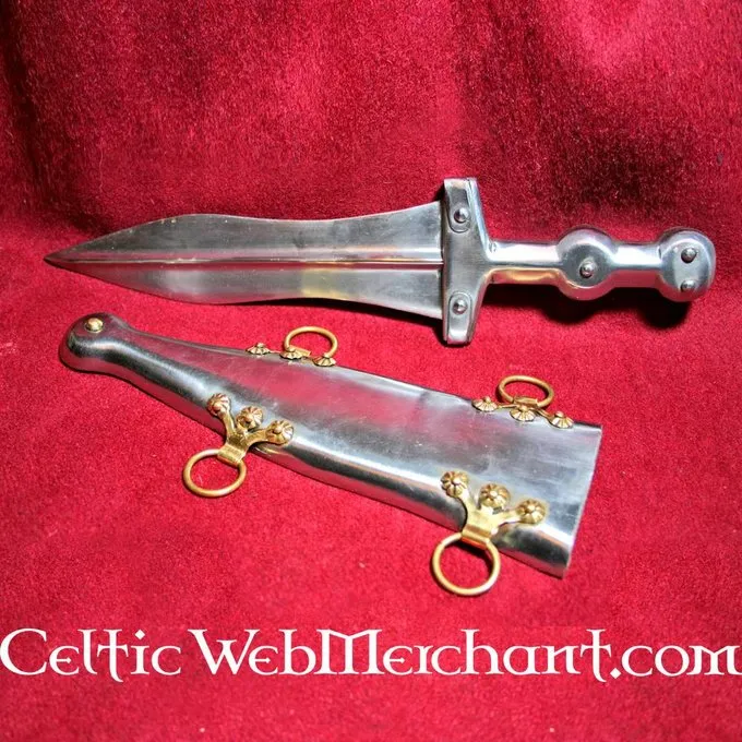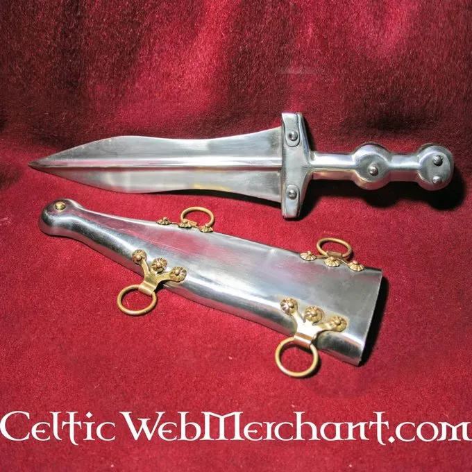 Deze pugio is gemaakt naar een 1ste eeuws exemplaar teruggevonden in het Rijngebied. De pugio was een secondair wapen voor o.a. de Romeinse legionair. Hij maakte geen deel uit van de standaard wapenrusting, maar werd door de legionair zelf gekocht.