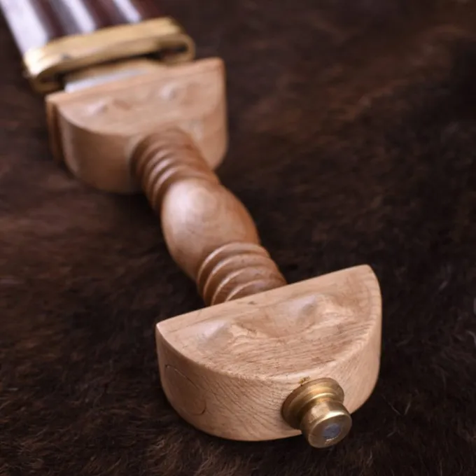 Deze spatha is geen exacte replica van 1 bepaald museumstuk, maar het is gebaseerd op vondsten van verschillende spatha’s uit de tweede eeuw n.C. die worden tentoongesteld in het Limes Museum in Aalen, Duitsland. Vanaf het einde van de tweede eeuw begon de spatha aan populariteit te winnen onder de Romeinse legionairs en auxiliae, ten koste van de gladius die eeuwenlang het meestgebruikte wapen was. De spatha was een stuk langer dan de gladius, hierdoor was het ook voor de cavalerie ideaal. De infanterie droeg de spatha aan de rechterkant en de cavalerie droeg hem aan de linkerkant. Deze spatha heeft een prachtig houten gevest en een geschroefde pommel. Hij wordt geleverd inclusief een leren schede met houten kern. De schede heeft een mooie messingen riemlus (voor riemen tot 5,5 cm breed) en messing beslag aan de boven- en onderkant.