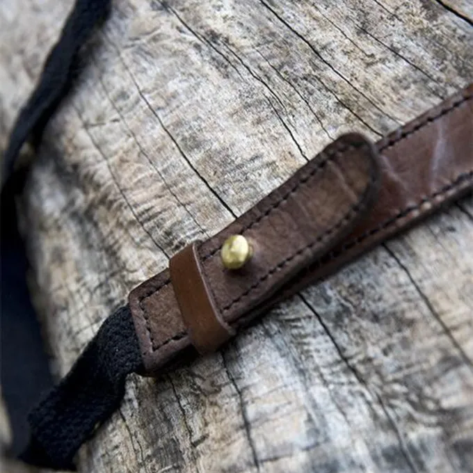 Details/Materiaal: canvas, leer, messing/Kleur: bruin-zwart/Lengte houder: 16 cm/Min. breedte: 6 cm/Max. breedte: 10 cm/Breedte rugriem: 2,5 cm/Lengte rugriem: 65 cm/Gewicht: 220 g/Verzendgewicht: 500 gram