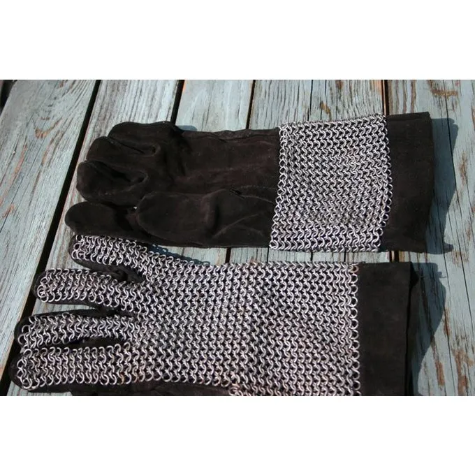 Deze handschoenen zijn gemaakt van suède en bedekt met 1,6 mm dikke, verzinkte, ongeklonken maliënringen met een binnendiameter van 6 mm. De ringen zijn vier in één gevlochten. De handschoenen zijn gemaakt in handschoenmaat 9.
