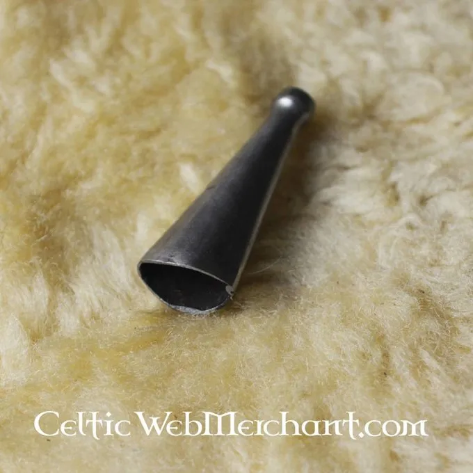 Deze punt beschermt en verstevigd de zwaardschede. Hij is gemaakt van tin en 5 cm lang, 1,8 cm breed en weegt 9 gram.