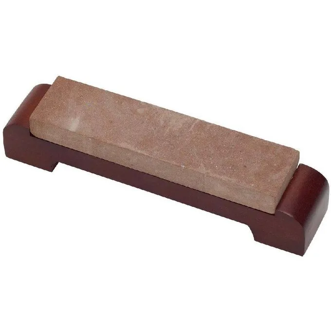Zandsteen wordt al voor duizenden jaren gebruikt om wapens en gereedschappen met te slijpen en te polijsten. Deze zandsteen heeft ongeveer korrel 240 en is voorzien van een houten voetstuk. Hij is ca. 20 x 5 cm lang en 1,9 cm breed.