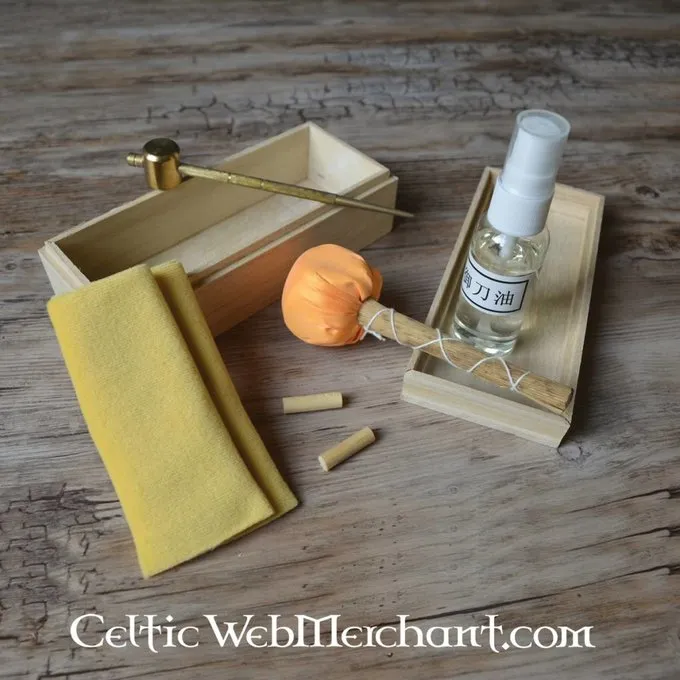 Traditioneel verzorgingsset voor Japanse katanas, wakizashis en tantos. Dit verzorgingsset bevat olie voor de kling, nugui gami papier, oliedoekjes, uchiko, mekuginuki en saya shimming veneer.