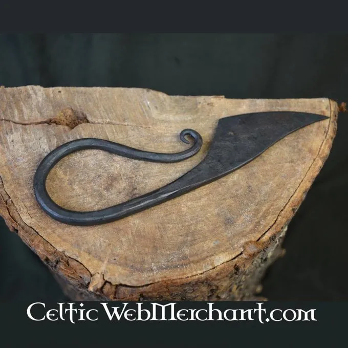 De krul aan de grip van dit mes geeft hem een typisch noordelijk uiterlijk. Dit soort messen werden door de gehele middeleeuwen gebruikt voor allerlei bezigheden. Het mes is met de hand van koolstofstaal gesmeed, heeft een lemmet van 8,5 cm en is in totaal 20 cm lang.