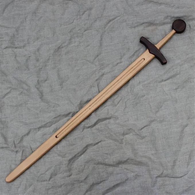 Houten zwaarden zijn een geweldig alternatief voor stalen zwaarden om zwaardvechten te trainen. Ze zijn goedkoper dan stalen zwaarden. Als je het trainen een paar keer per maand afwisselt met een houten wapen, gaat je dure zwaard al veel langer mee. Houten wapens zijn ook geschikt voor kinderen. Voor re-enactmentgroepen en zwaardvechtscholen zijn houten zwaarden heel geschikt om mensen te leren zwaardvechten, vooral omdat beginners het zwaard nog verkeerd hanteren en zo onbedoeld schade kunnen aanrichten aan de kling. Dit houten zwaard is gebaseerd op zwaarden uit de 12de tot 15de eeuw. Het zwaard is gemaakt van contrasterend licht en donker hardhout.