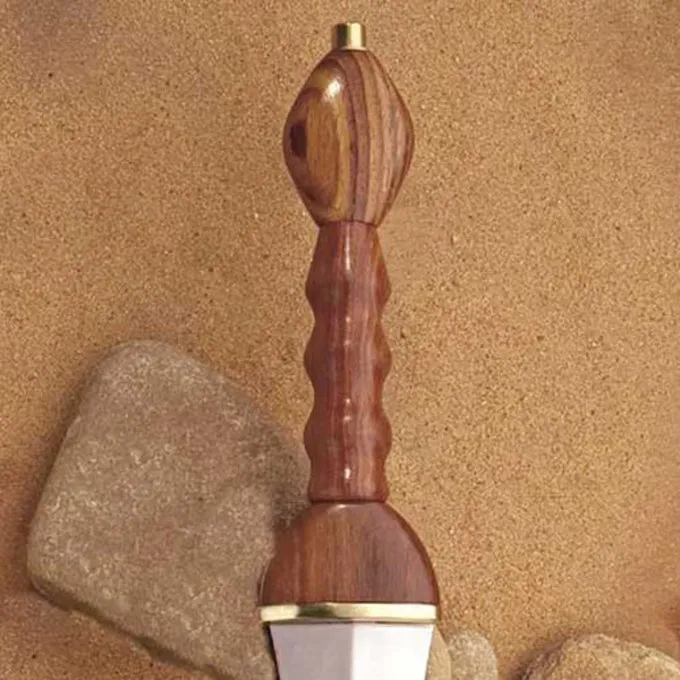 Een mooie pugio met schede van Windlass Steelcrafts, gebaseerd op een origineel in het British Museum. De pugio was een dolk die Romeinse legionairs gebruikten voor close combat. Dit soort Romeinse dolken werden meestal niet door burgers gedragen, maar handelaars en andere reizigers droegen wel een pugio op reis. Zo kon men zich beschermen tegen barbaren aan de randen van het Romeinse Rijk of tegen rovers. Deze pugio heeft een houten grip en de schede is voorzien van messingen beslag en ringen om hem aan je riem te hangen. De kling is gemaakt van getemperd 1055 koolstofstaal met een hardheid van 48-52 HRC. Perfect voor reenactment van een Romeinse legionair, een Romeins kostuum of voor de verzamelaar van Romeinse wapens. Wanneer je de pugio afbot, is hij geschikt voor reenactment battles.